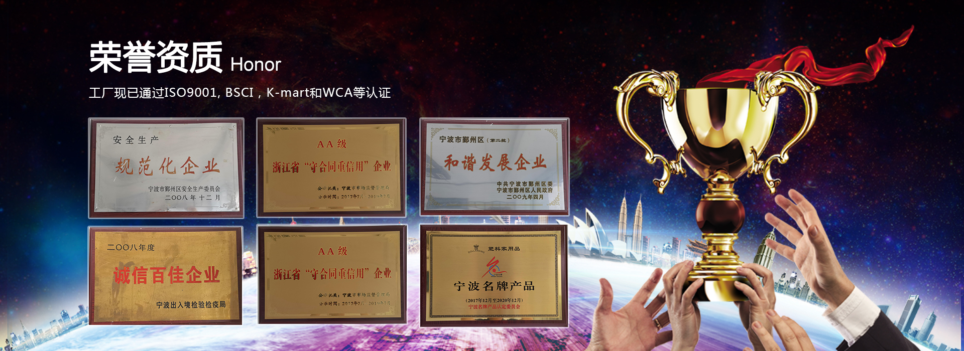 工廠現(xiàn)已通過(guò)ISO9001, BSCI,K-mart和WCA等認(rèn)證。